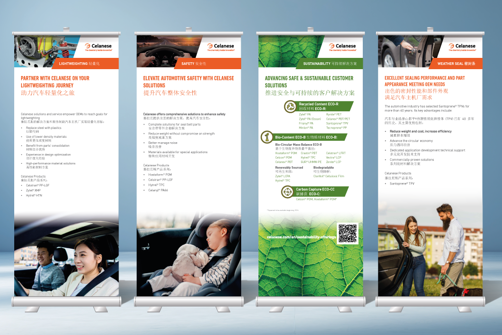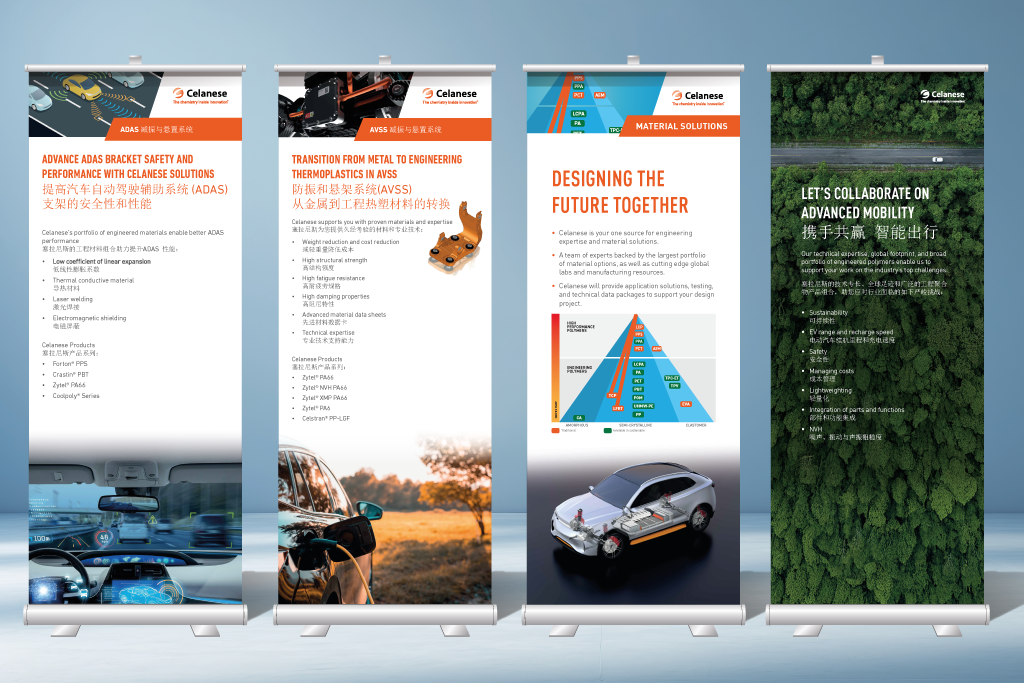 Für den Einsatz in China wurden vorhandene und neue englische Roll-Ups durch chinesische Texte ergänzt. Sie behandeln unterschiedliche Themen und Produkte des Unternehmens und werden für verschiedene Veranstaltungen eingesetzt.